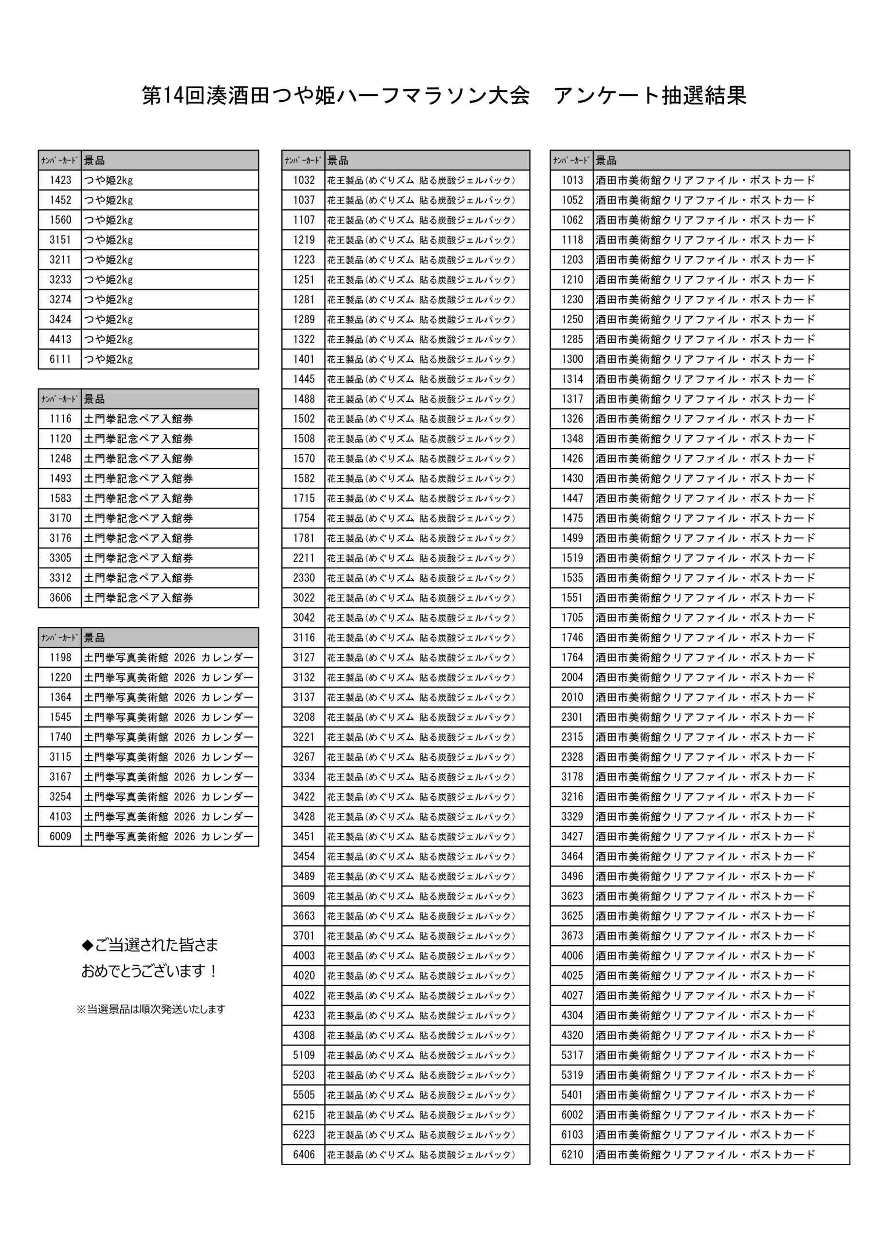 第14回湊酒田つや姫ハーフマラソン大会アンケート抽選結果